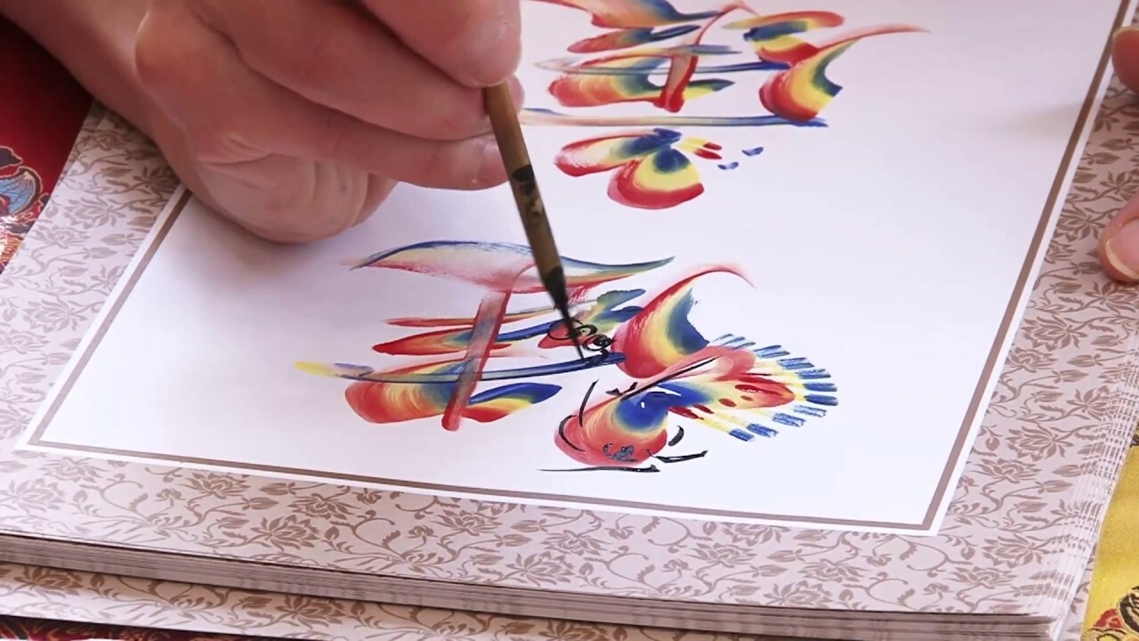 「彩虹書法」又名「龍鳳書法」,早在唐代武則天已經出現,當時是用龍和鳳兩種代表吉祥的神獸的的圖案勾勒出各種漢字,最初書法在畫在竹片上,顏色只有黑色。 到了近代,有書法家想到除了龍鳳之外,還可以用不同顏色及生肖和花鳥魚蟲,融合了美術與書法。